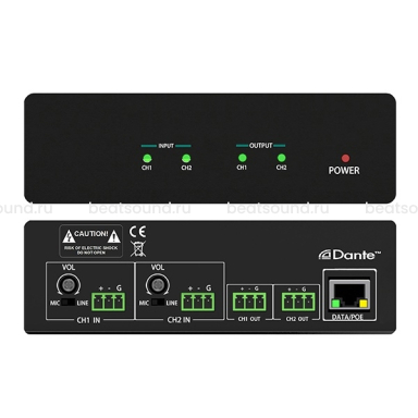 DANTE-аудиоинтерфейс по схеме 2х2. Оснащен двумя симметричными аудиовходами и двумя симметричными аудиовыходами.