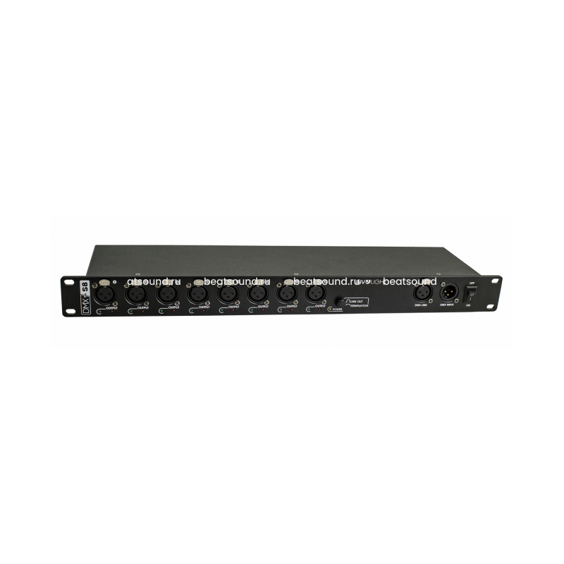 DMX-сплиттер "DMXS8" имеет один вход и восемь выходов. Для подключения на каждый канал предлагается трех-контактный XLR разъём, который служит в качестве DMX-выхода. Каждый DMX-выход имеет независимый трансформатор. С помощью переключателя LINK-выхода возможно завершить или продолжить DMX-сигнал на другие приборы.