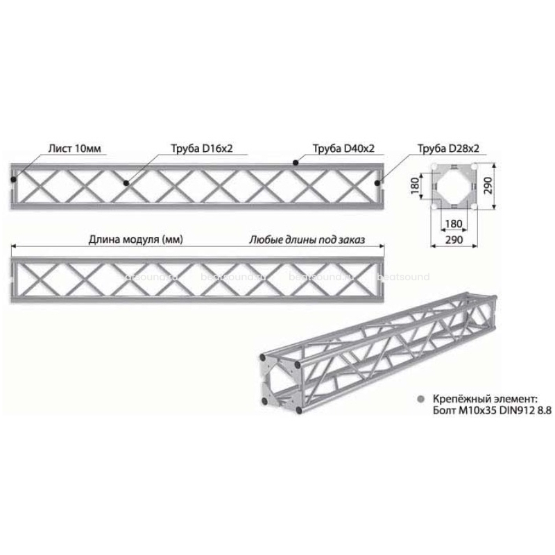 Прямой модуль квадратной конфигурации длиной 1000мм, 290x290мм, d40x2 \ d16x2мм. Крепежный размер 180х180мм, М10. Рисунок перемычек круговой. Читать подробнее