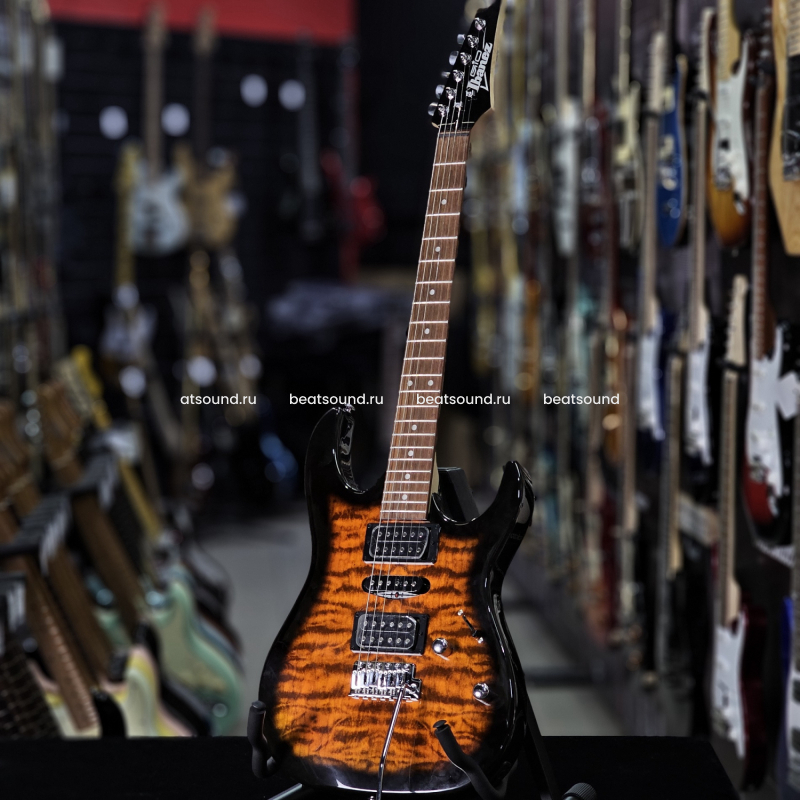 Ibanez GRX70QA - бюджетная 6-струнная электрогитара формы Superstrat с конфигурацией звукоснимателей HSH. Электрогитара имеет корпус из тополя с топом из узорчатого клёна, кленовый гриф радиусом 15,74 дюйма с накладкой из палисандра и 22 ладами. Модель имеет звукосниматели Standard BH/MS/NH с пятипозиционным переключателем режимов работы, ручки общей громкости и тона. 3 звукоснимателя и пятипозиционный переключатель делают гитару более чем универсальной. Также на гитаре установлена тремоло-система FAT-6 bridge, хромированная фурнитура и стандартные колки GIO. Читать подробнее