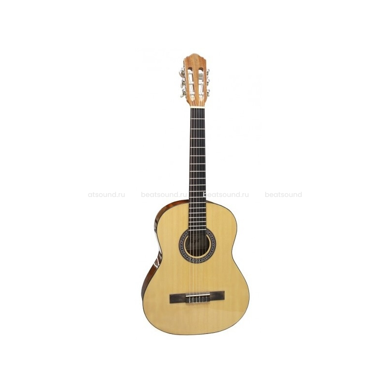 Верхняя дека изготовлена из ели, что обеспечивает чистое звучание, так необходимое для грамотного развития слуха. Нижняя дека и обечайки из сапеле, породы дерева по свойствам очень схожим с красным деревом, благодаря чему звук приобретает мягкость и глубину. Достаточно толстая, порядка 6 мм, палисандровая накладка на грифе создает в руке ощущение приятной весомости и надежности.
